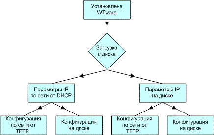 Для загрузки по сети должны работать службы DHCP и TFTP. В самом простом случае, если у вас в сети не было своего DHCP и при установке WTware вы не запретили установку служб WTware DHCP и TFTP, нужные службы у вас уже должны работать. Если у вас есть свой DHCP, его нужно настроить.