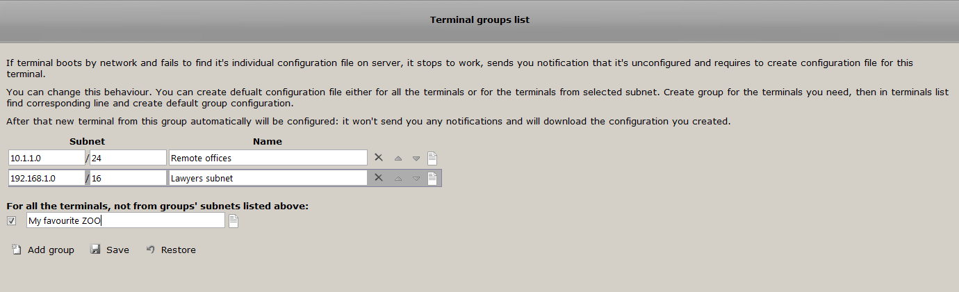 Также есть группа "Для всех". Можно создать конфигурацию по умолчанию для всех терминалов, которые не входят в подсети созданных вами групп.